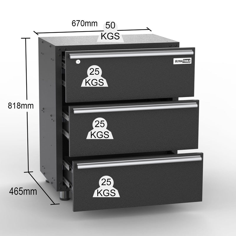 Garage 3 Drawers Storage Cabinet - UltraTools 670mm x 465mm x 820mm Black Workshop