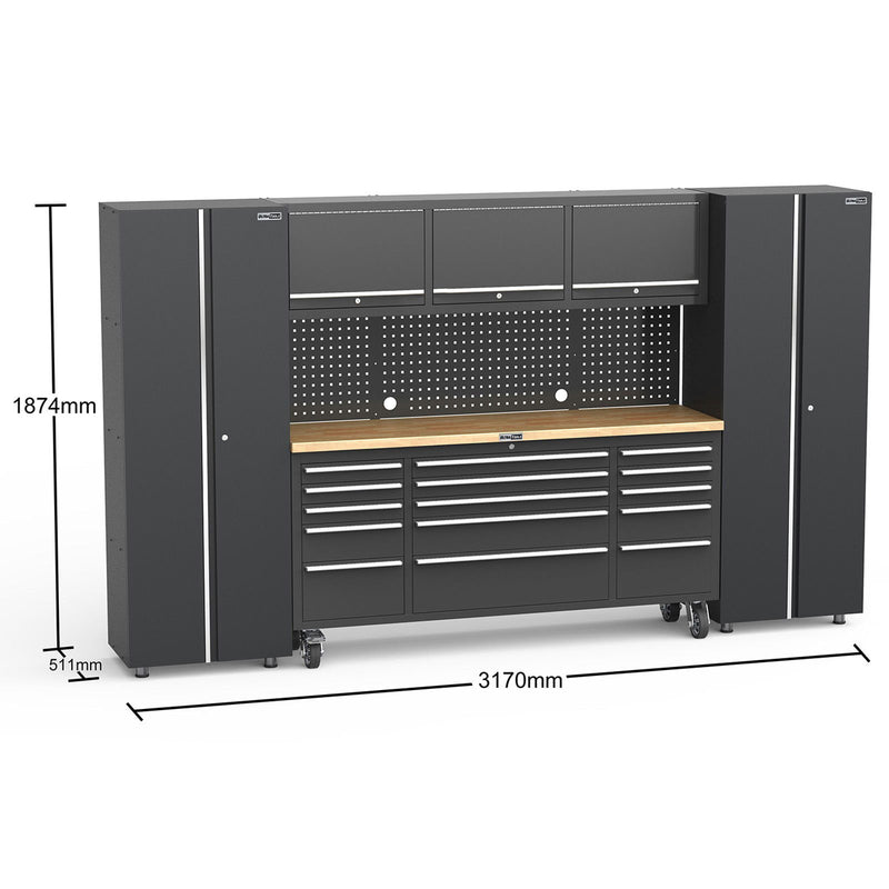 The UltraTools Black 72" Mobile Work Bench with 15 Drawers Tool Chest & 3 Door Cabinet is designed for durability and functionality, combining modern aesthetics with practicality. This heavy-duty roller cabinet is perfect for the most demanding users, providing a complete storage solution in one unit. It features 15 drawers with a maximum load capacity of up to 35kg each, a 460mm tall pegboard for hanging tools, and a 3-door upper cabinet for additional storage. The toolbox also includes 6" heavy-duty casters, a flat key locking system, and EVA drawer liners to keep your tools in place. With a 38mm thick solid timber worktop and anti-fingerprint finish on the steel components, this workbench offers both style and durability.