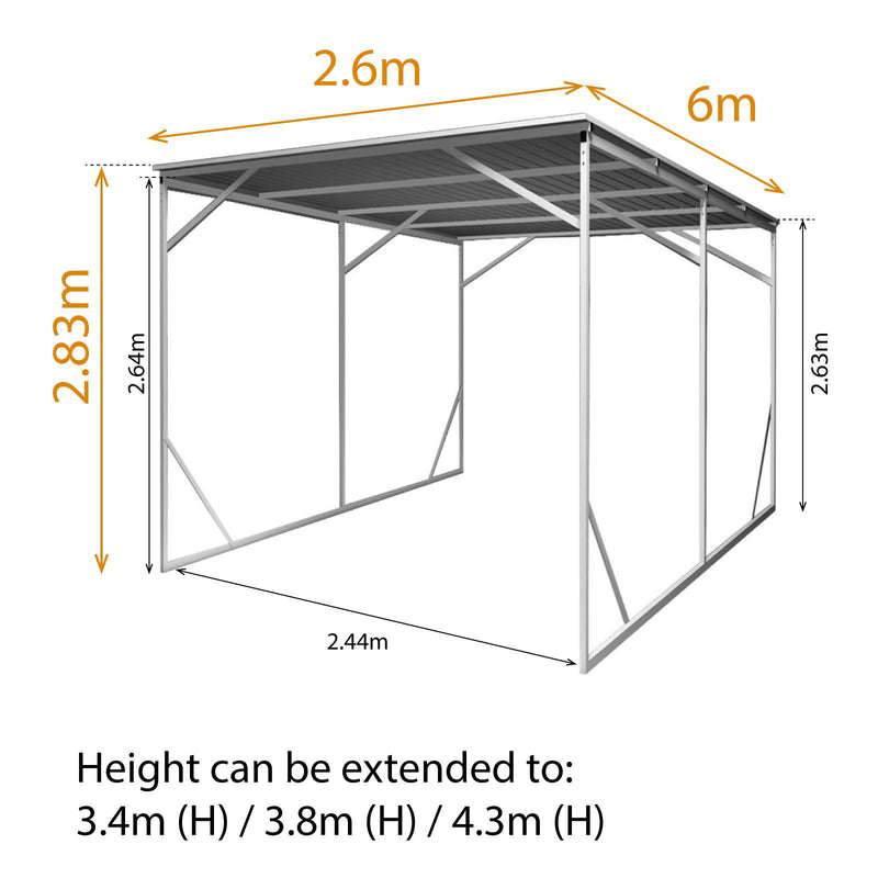 Vehicle Shelter 2.6m x 6m x 2.8m Steel Carport